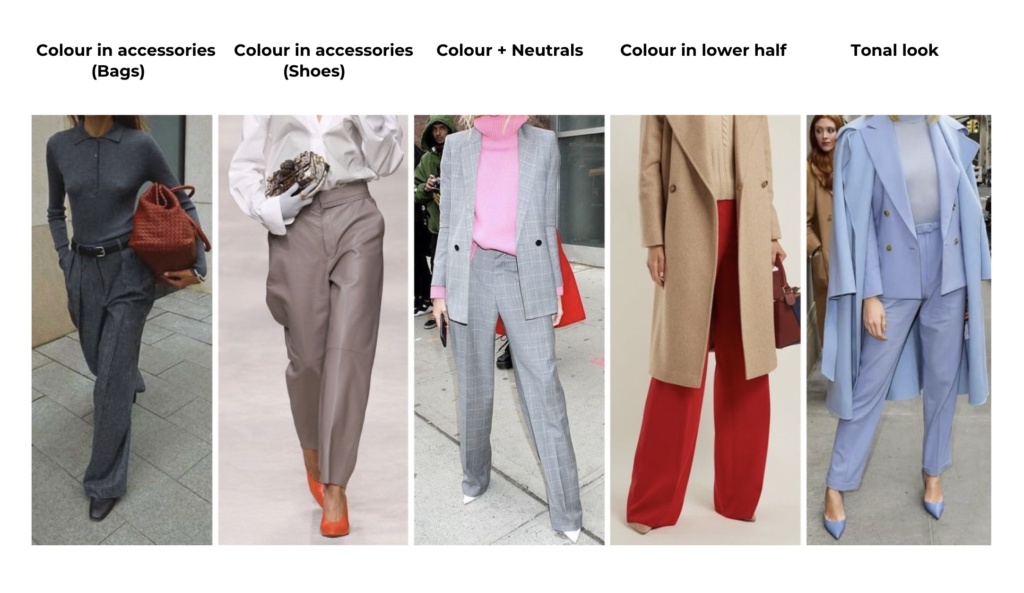 Here are 5 style tips on how to introduce more colour into your outfits (see examples below):