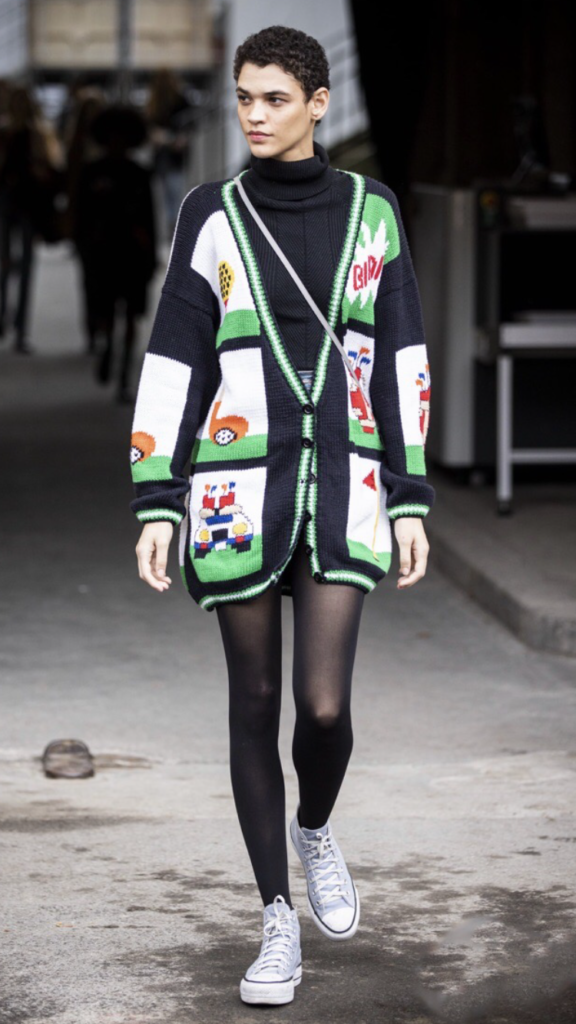 When wearing a cardigan as a dress, go for the high-low look with a pair of vintage-looking sneeakers on the bottom.