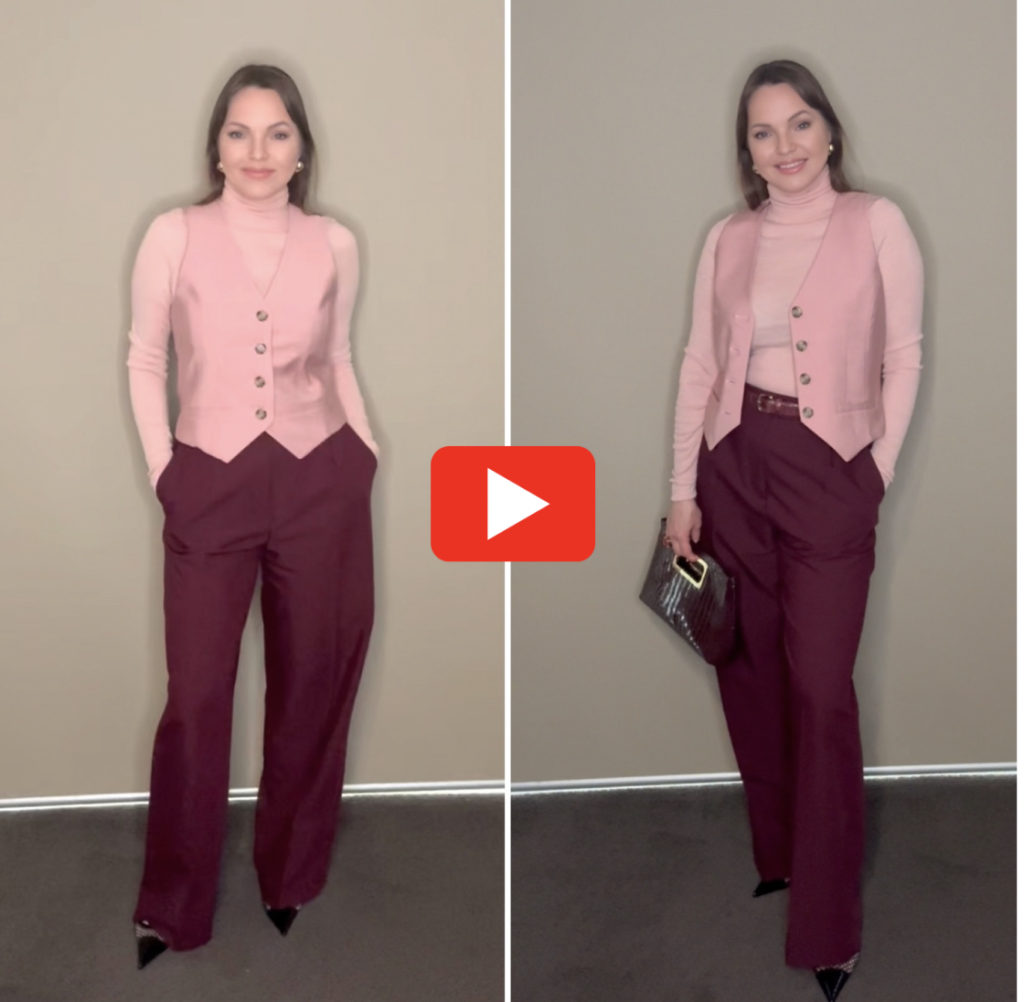 In today’s look, I’ve styled a light dusty pink turtleneck and vest with burgundy trousers — a tonal outfit combination that’s both soft and sophisticated.